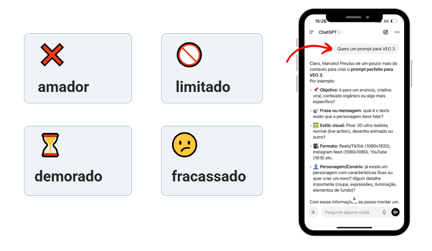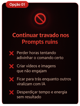 Enquanto isso, quem usa prompts validados cria vídeos e imagens virais em minutos e dispara na frente.